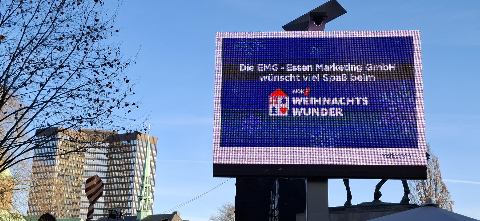 Für den 16. Dezember 2025 hatten wir geplant, den symbolischen Scheck an das „WDR2 Weihnachtswunder-Team“ zu übergeben. Also erst solch einen Riesenscheck besorgen, nach Essen fahren, ein wenig zeitliche Sicherheit einbauen. Aber wir waren pünktlich, sogar etwas überpünktlich. Dort auf dem Bugplatz in Essen herrschte allerdings Karneval, Weihnachten und Ostern zusammen. So viele Menschen, Kameras, die das Ganze live ins Netz übertrugen, Schlangen von Menschen, die ihr Scherflein beitragen und einen Musikwunsch ergattern wollten und die Hauptschlange stand vor dem WDR2 Glashaus. Sie reichte über den ganzen Platz, um die Kurve herum und weit in die Nebenstraße hinein. 150 Minuten Anstehzeit waren vorhergesagt – und das mit einer bestenfalls minimalen Chance, im Radio wieder Gehör zu finden. Also haben wir uns entschlossen, einen alternativen Plan zu entwickeln und wir haben uns mit der schönen Kölnpfad UltraWandern 2025 Rückwand vor eine große blaue „WDR2 Weihnachtswunder-Säule“ zu stellen, dort ein paar Fotos zu machen und machen zu lassen, die Überweisung des Geldes findet dann ganz banktechnisch mittels SEPA statt.
