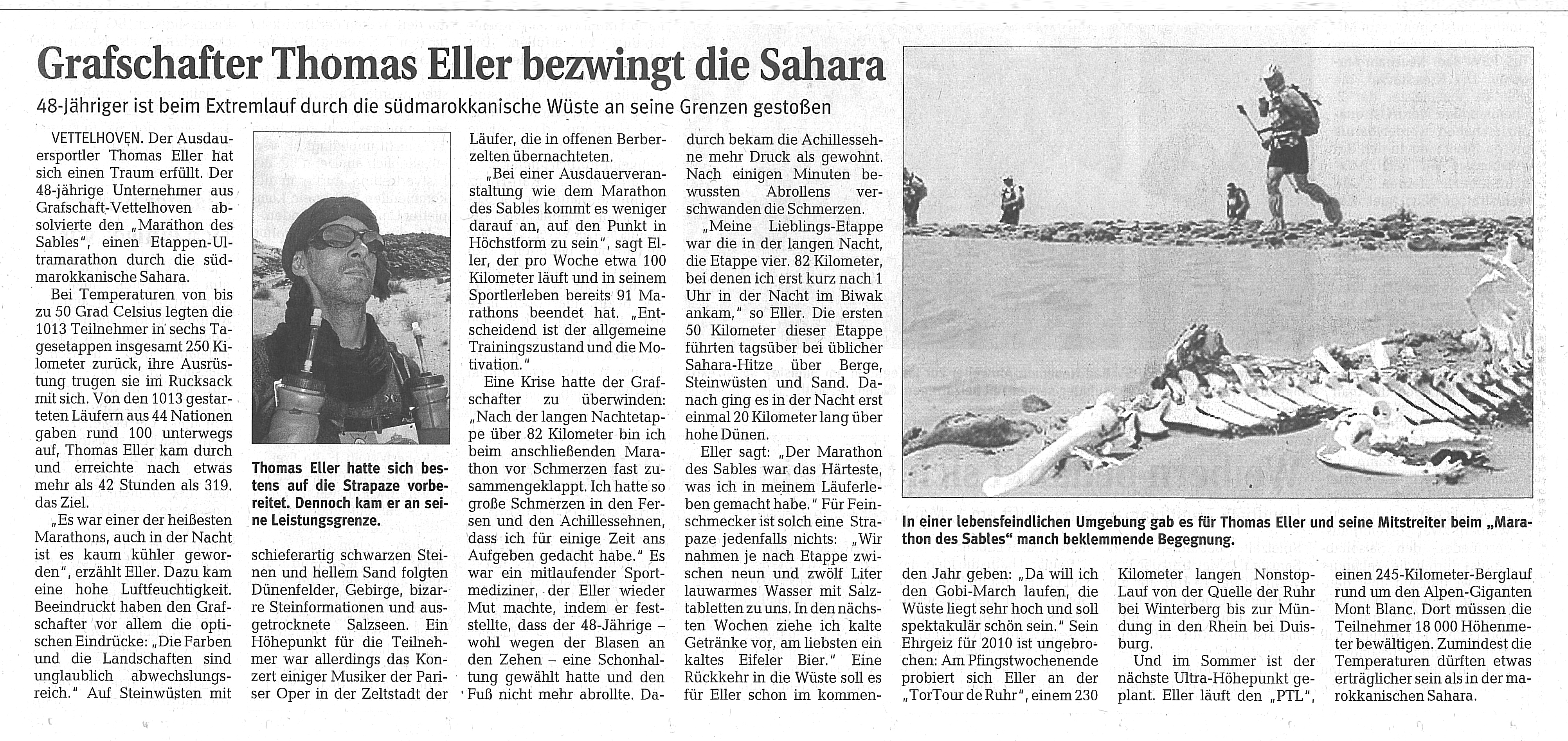 Insgesamt war es erst der zweite große Zeitungsbericht in der Rhein-Zeitung über die Läufe, die ich hinter mich gebracht habe. Der erste war Anfang September 2009 der Bericht über die 41:53:22 Stunden des UTMB rund um den Mont Blanc. Beide Berichte verbindet, dass ich hier im Umkreis der einzige UTMB– und MdS-Finisher zumindest der letzten Jahre war. Dass mir beide Fotos besondere Freude bereitet haben, brauche ich nicht zu erläutern, oder?