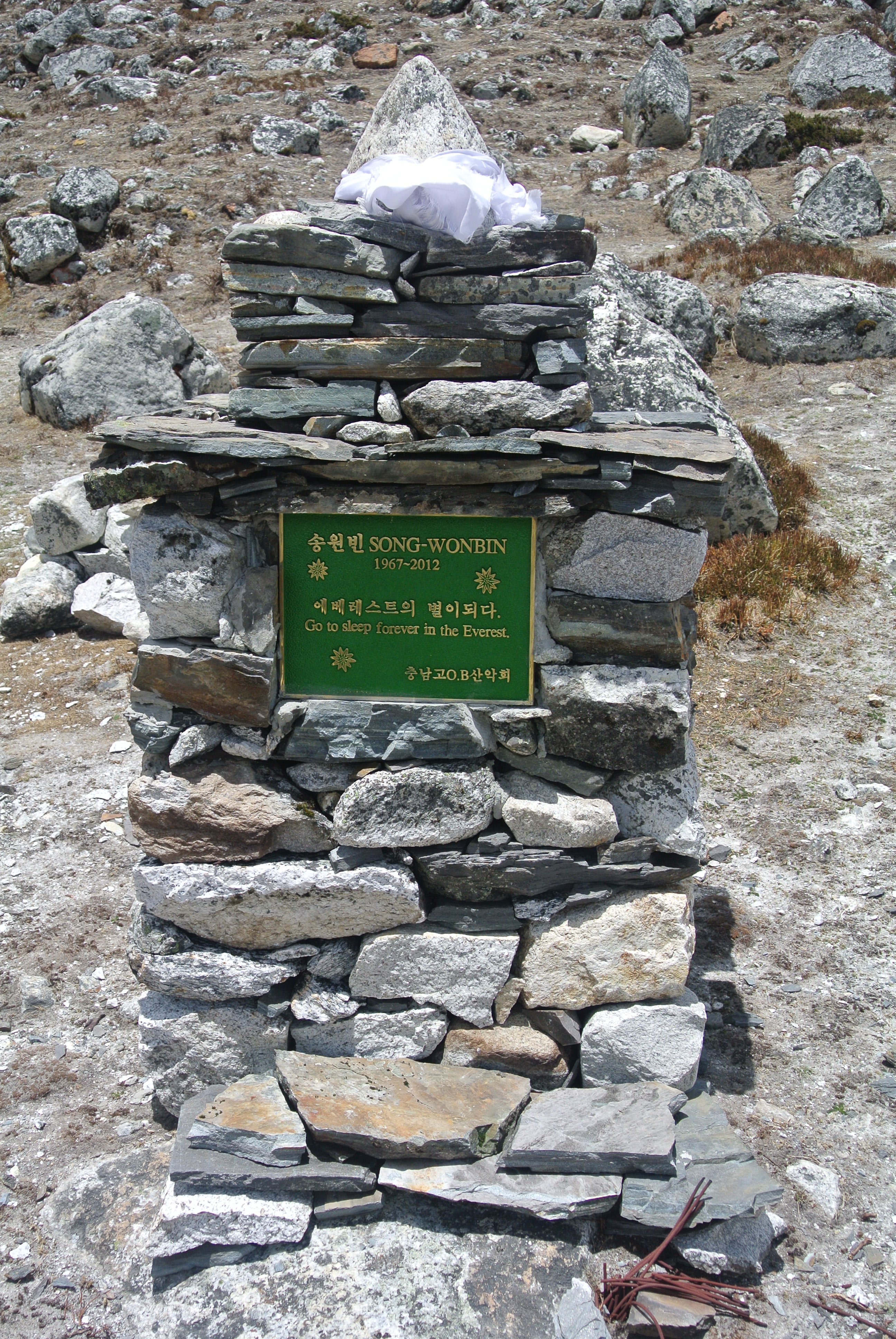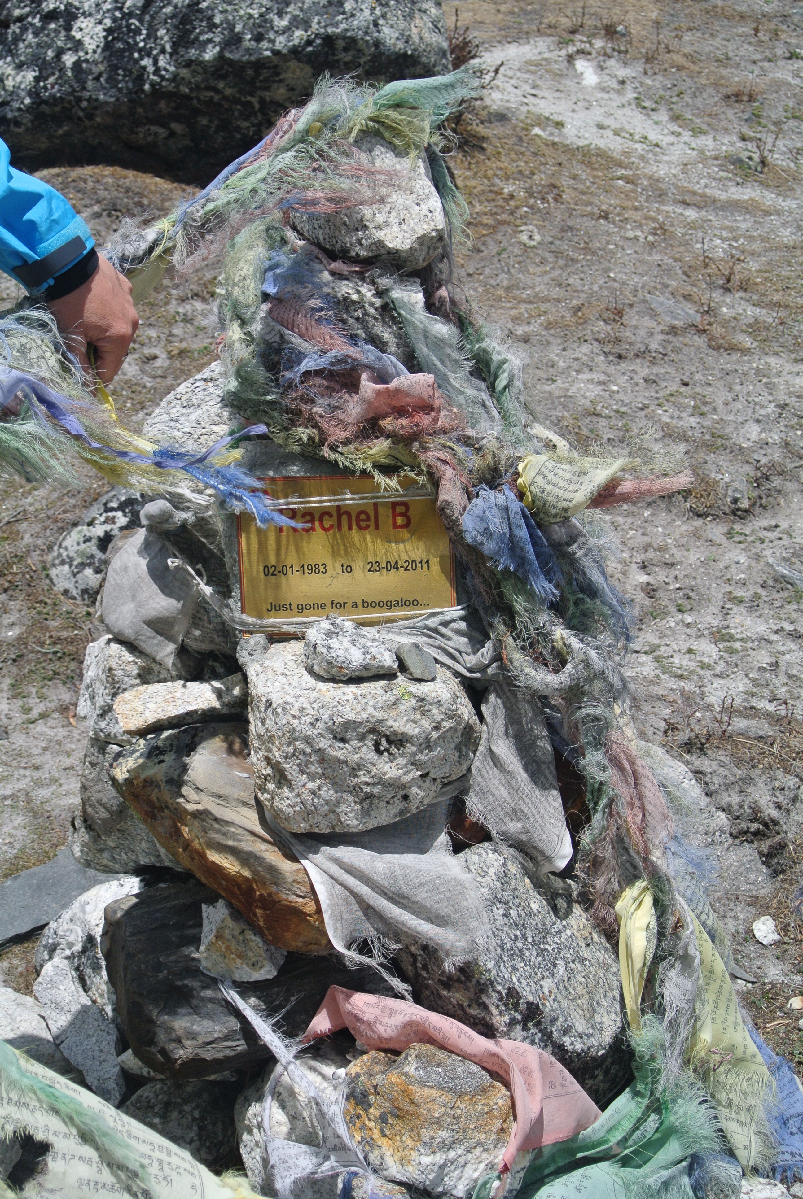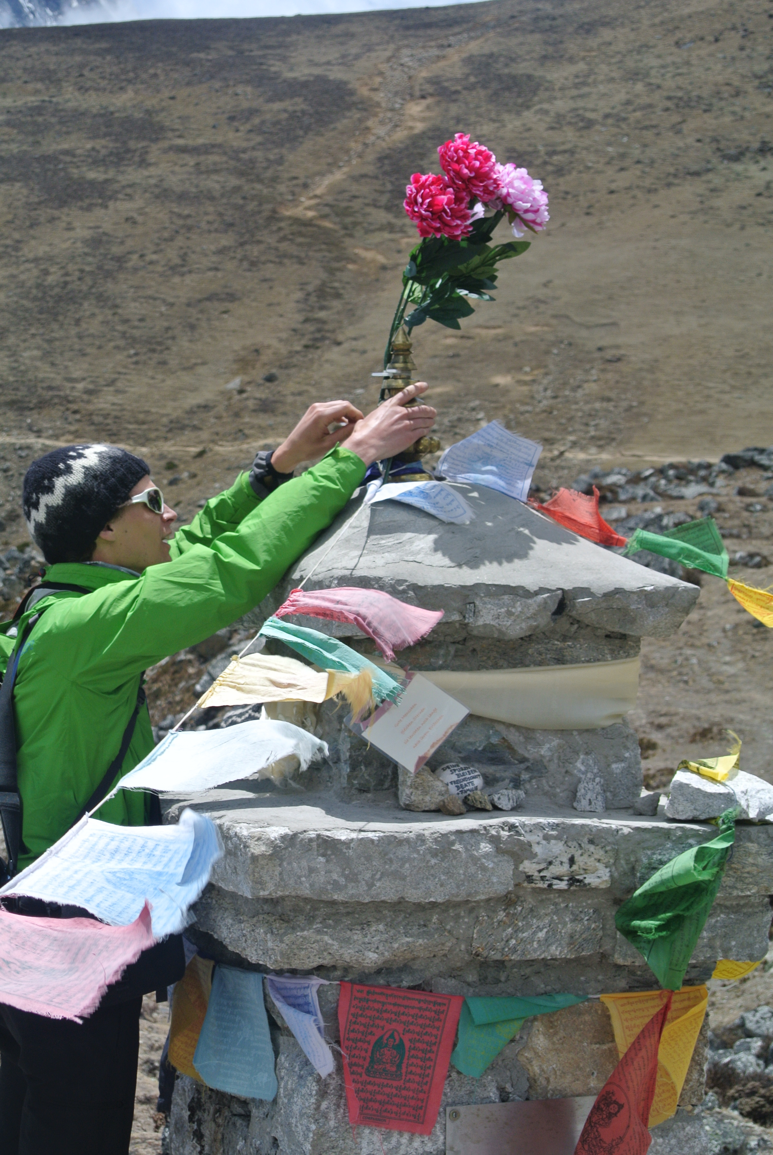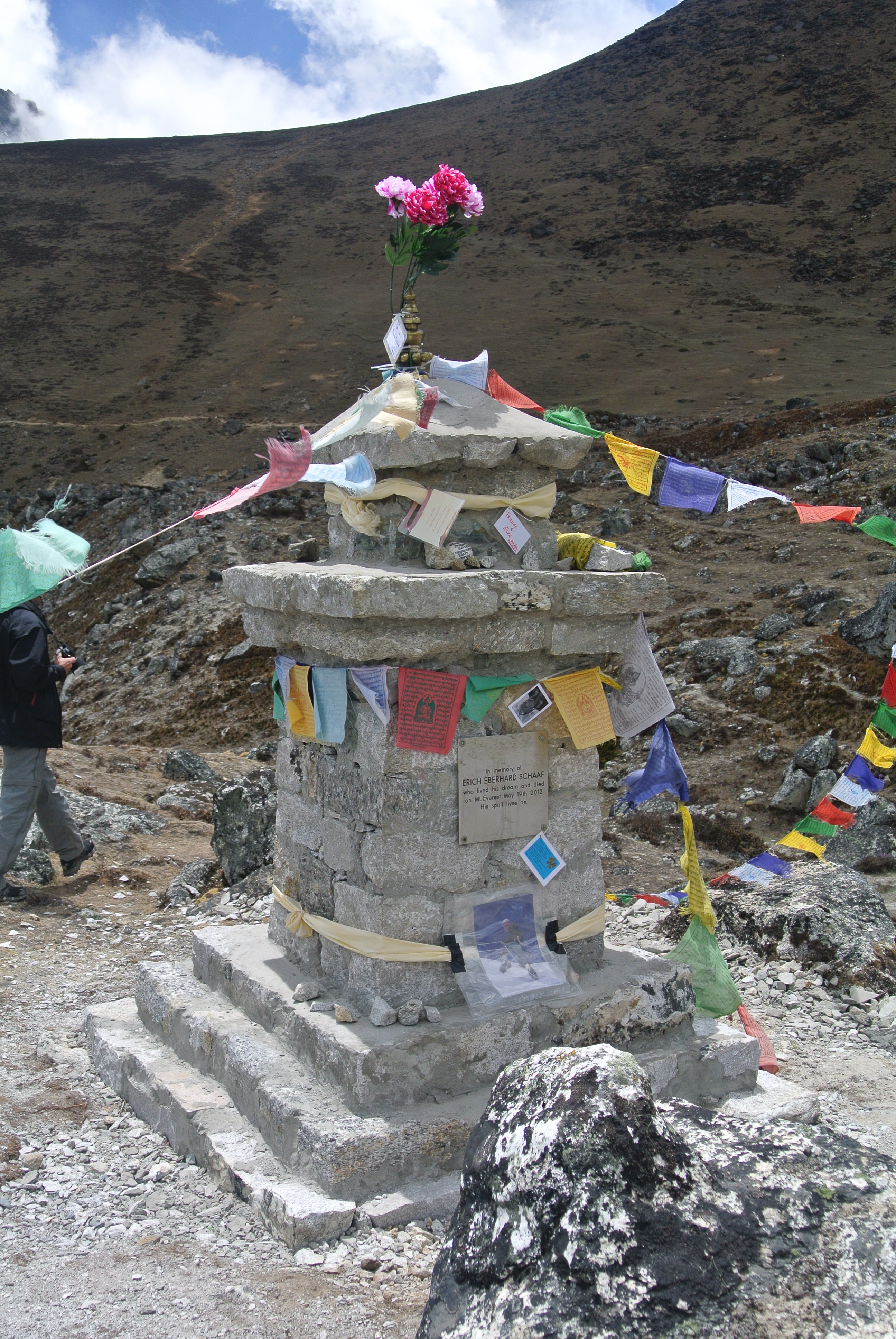Aber es wurde ihm, wie so vielen anderen Helden auch, ein Steindenkmal errichtet, als Mahnmal und zum Gedenken. Paul Thelen schmückte diese dann so gut es ging und Henk beschloss, seine Angst vor der Höhe zu überwinden und mit dem Trekking zum Mt. Everest Basecamp (EBC) diesen Ort der Stille zu besuchen, ihn weiter zu schmücken und auch, dort kleinere Erinnerungskarten an Eberhard abzulegen.
