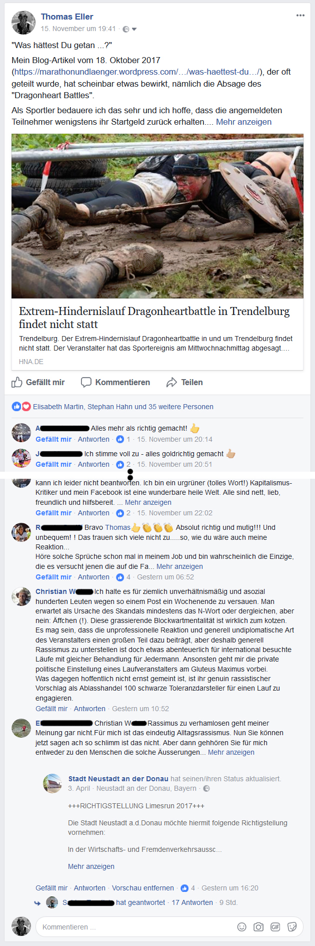 Mit „asozial“ wollte ich auf die Unverhältnismäßigkeit hinweisen, dass auf der einen Seite drei Personen beleidigt werden, auf der anderen Seite aber hunderten Personen konkret etwas negatives passiert. Vermutlich wissen die drei noch nichtmal von ihrem Glück. Im Ergebnis hat die Aktion also mehr Leuten geschadet als genutzt. Eine Kollektivstrafe quasi. Ich glaube ihnen, dass sie den Sportlern das Wochenende gegönnt hätten, und sich der Tragweite bewusst sind. Aber dennoch halten sie an ihrem höheren Ziel fest. Das Bild vom Stein ins rollen ist insofern schief, weil sie über das mitdiskutieren und FB-melden hinaus mit dem weiterleiten an Presse und Behörden das Steinchen noch mehrmals getreten haben, bis es denn lief. Wenn sie das ganze nur bei der Polizei angezeigt hätten, in der Annahme das wäre Volksverhetzung, hätte ich keine Probleme damit. Aber dass dann spätestens die Presse nicht zur Deeskalation beiträgt, ist vorhersehbar. Natürlich trägt auch der Veranstalter für die Absage Verantwortung, aber Sie eben genauso über den Auslöser hinaus. Die Prozesse in der Stadt und zu wieviel Prozent andere Sachen relevant waren kenne ich nicht. Ich hätte als Bürgermeister allerdings noch für 2018 keine Entscheidung ohne juristische Grundlage und nicht vor den Erfahrungen aus dem aktuellen Lauf getroffen.