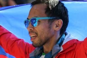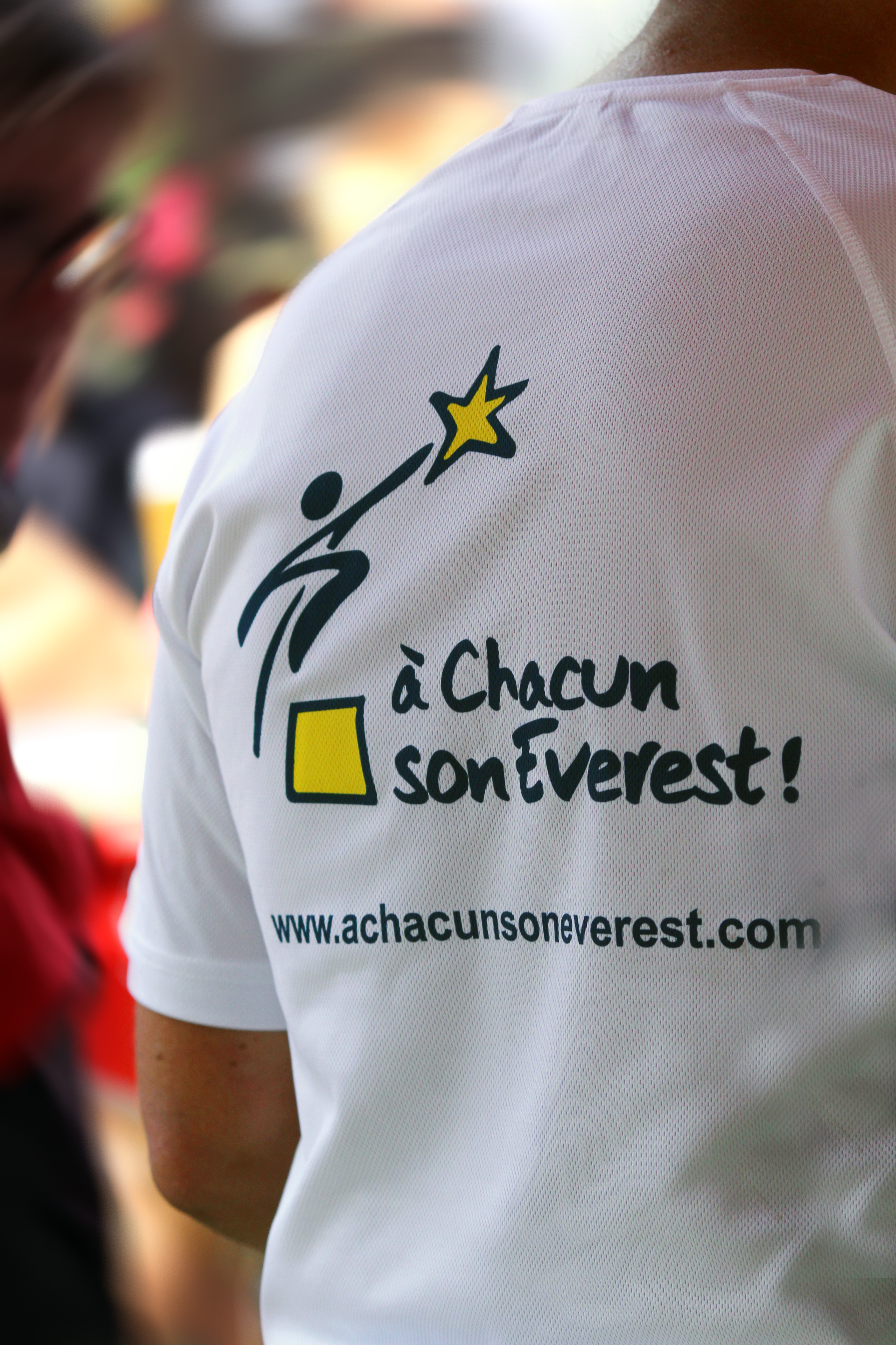 Ein Franzose jedoch, der schon von seiner Familie und seinen Freunden erwartet wurde, blieb stehen und zog sich sein verschwitztes und schmutziges Laufshirt aus, um für das Finish ein ganz frisches Shirt überzustreifen. Und auf diesem Shirt standen das Logo und der Name der Organisation „A Chacun son Everest !“ – mit der Webadresse auf strahlend weißem Grund.