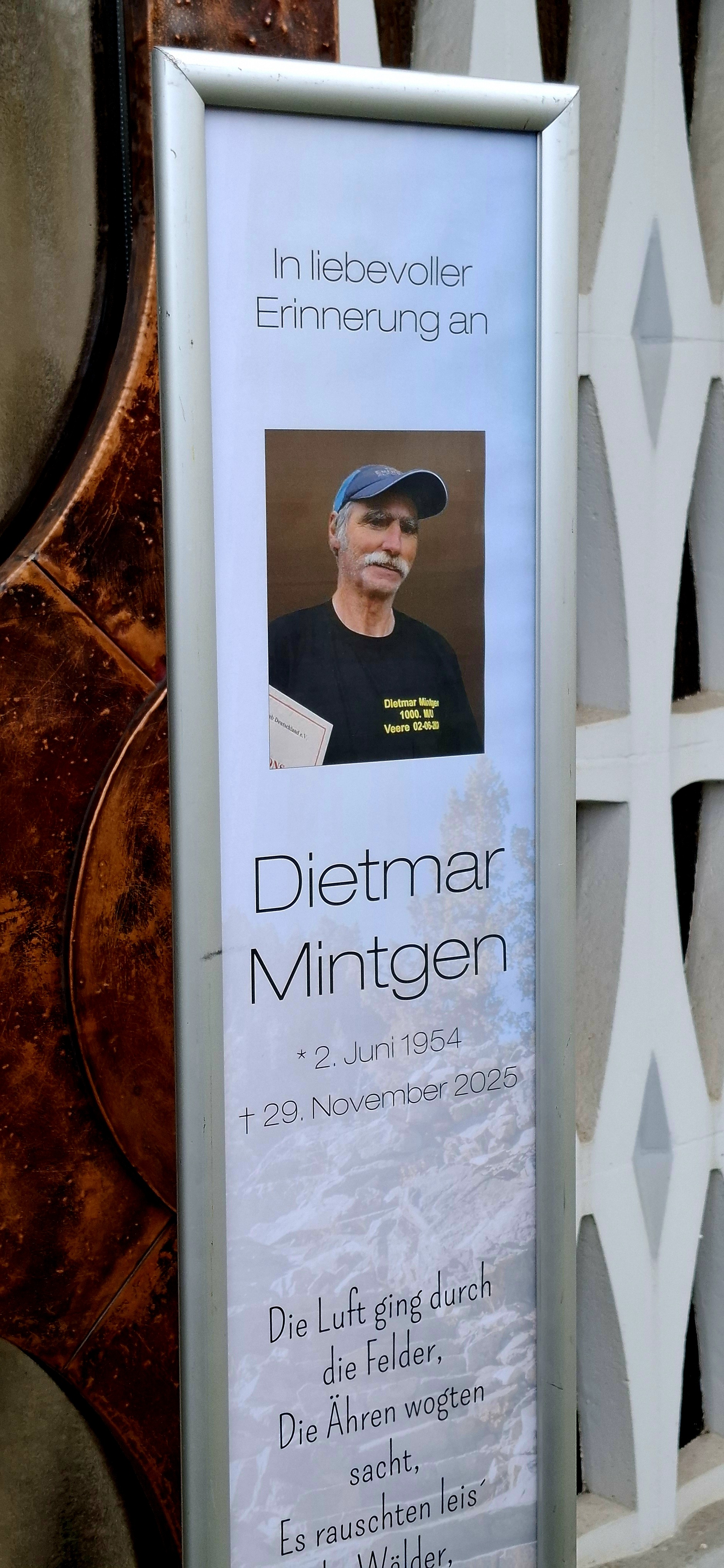 Gleich zwei Mal durfte ich Abschied nehmen von einem der ganz Großen im Lauf- und im Ultrawandersport. Dietmar Mintgen, geboren am 2. Juni 1954, erlag am 29. November 2025 bei einer Weitwanderung einem Herzfehler, als dieses einfach stehenblieb, trotz aufwändiger Versuche der Reanimation.