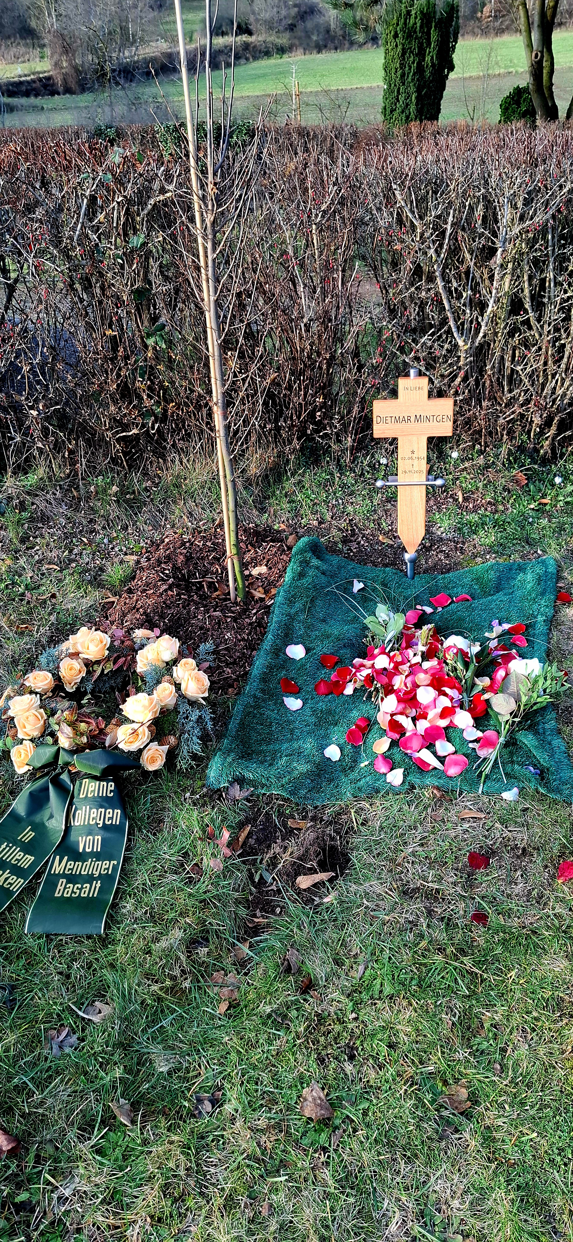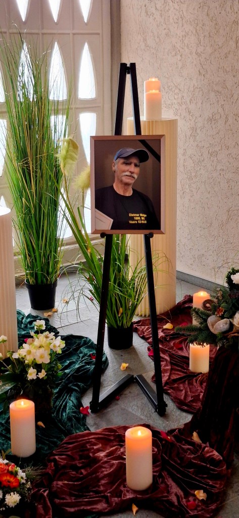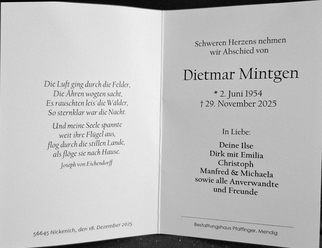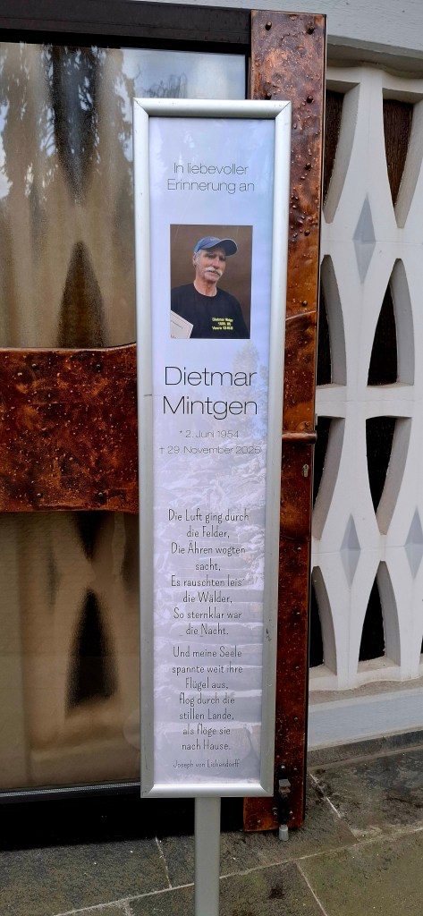 Und gestern, am Donnerstag, den 18. Dezember 2025, fand die Beisetzung der Urne von Dietmar statt. Christoph hatte mich dazu eingeladen, eine Einladung, die ich sehr gerne angenommen habe. So hatte ich ausgiebig Zeit, mich gedanklich und körperlich von Dietmar zu verabschieden. Zudem lernte ich Dinge aus Dietmars Leben, die mir bislang unbekannt waren.