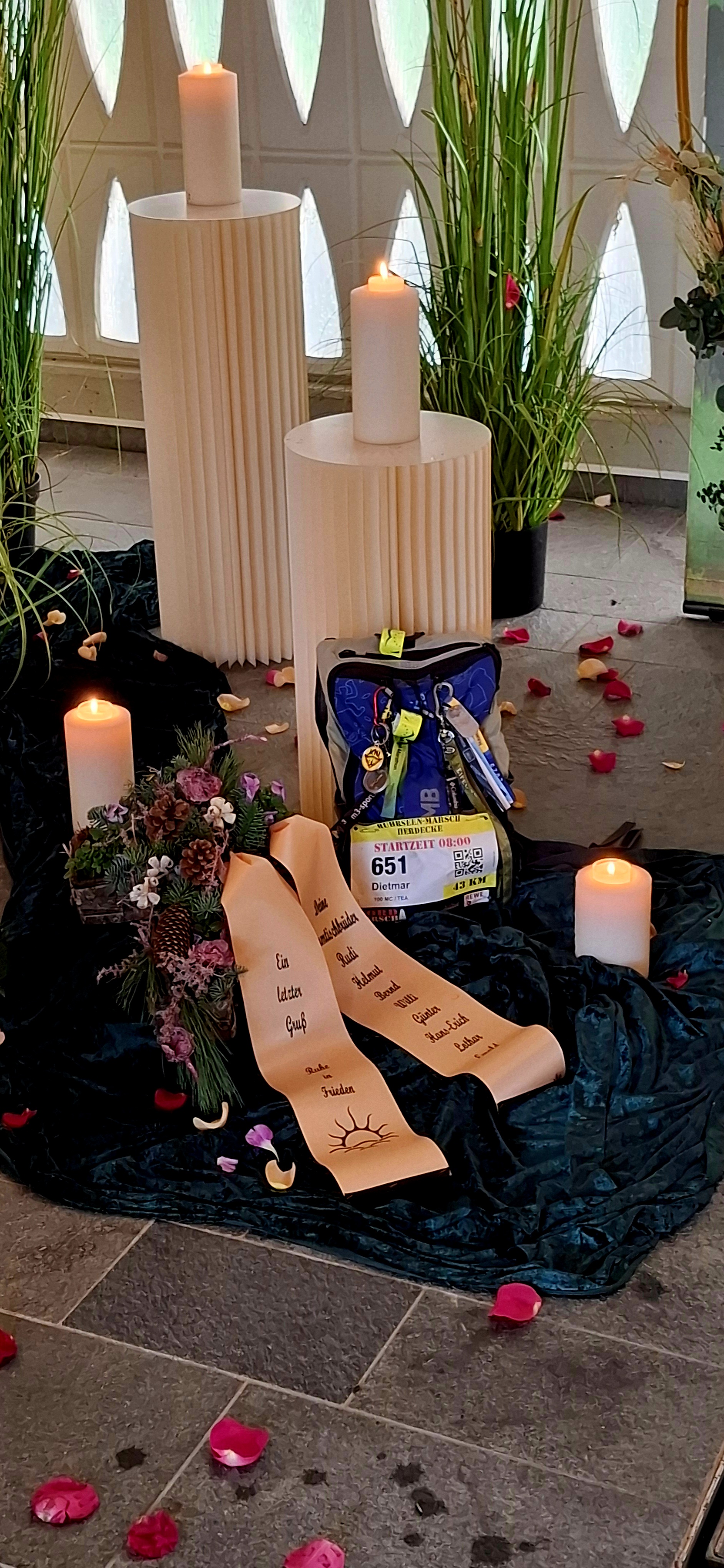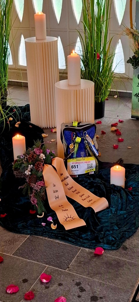 Die Trauerrede hielt die Trauerrednerin Sophia Dietrich, mit der ich einen Tag zuvor noch telefoniert hatte. Sie verglich Dietmars Leben mit einem Marathonlauf, den man voller Euphorie beginnt und der dann Höhen und Tiefen bringt. Welcher Läufer kennt das nicht?
