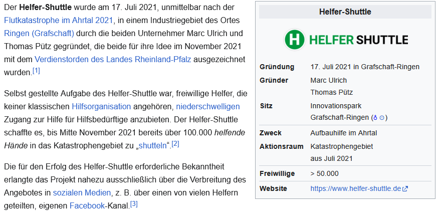 So wurde er ein wichtiger Baustein der Ahrtal-Hilfe. Nach der Katastrophe, die das Ahrtal heimgesucht hatte, wurden Hilfen organisiert und systematisiert. Über die Seite www.helfer-shuttle.de wurden die Helfer zu Abholpunkten gebeten und zielgerichtet zu Hilfsprojekten im Ahrtal gefahren und anschließend auch wieder abgeholt.