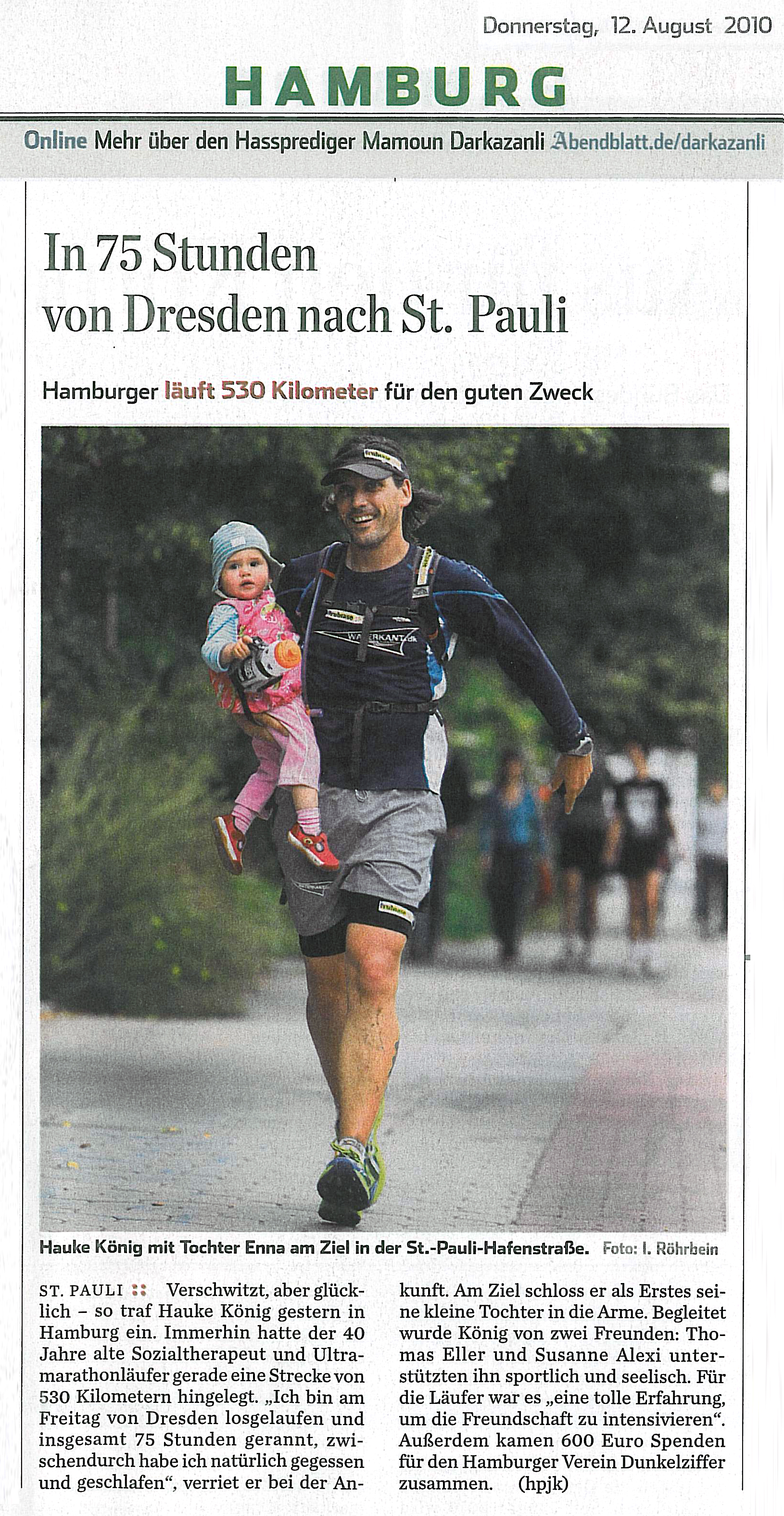 Susanne hält zwischen Wiesen und Pferdekoppeln, ich steige aus und laufe in Richtung Hamburg. Ach ja, Tom hatte zwischendurch noch von Zuhause (Grafschaft in NRW) angerufen und gefragt, ob es für mich ok wäre, wenn er beim Zieleinlauf in der Hamburger Hafenstraße dabei wäre. Er würde dann noch mal vorbeikommen. OK? Da ist fantastisch! Total verrückt, aber extrem super! Und noch während ich mich auf Tom und Hamburg und eine Dusche freue, klingelt mein Telefon und ein Fotograf der Hamburger Morgenpost möchte mich vor dem Ziel noch sehen und fotografieren. Wir verabreden einen Treffpunkt im Südosten Hamburgs und es werden Fotos gemacht. Er ist Hamburgs rasender Reporter und sieht auch ganz genau so aus. Etwas zerknitterter Leinenanzug, teure Schuhe (ich vermute er tanzt argentinischen Tango, oder will, dass man das von ihm denkt), längere Haare und ein lustiges Gesicht, das offensichtlich schon viel gesehen, aber auch mitgemacht hat.