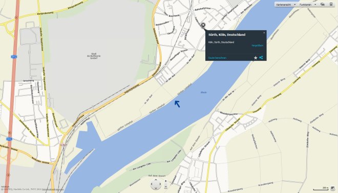 Wir sind also noch etwas südlicher als Köln-Rodenkirchen, nämlich auf der Höhe von Köln-Sürth. Wenn Du von Köln aus kommst, dann bist Du in etwa am letzten schönen Punkt der Strecke, kurz bevor mit dam Hafen und den Raffinerien von Wesseling der wenig schöne Teil des Rheins beginnt. Sehen kannst Du diese Beleidung der Augen aber schon …