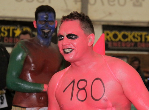 Michael Neumann im säuischen "Kampfdress". Er ist irgend etwas zwischen "Schweinchen Babe" und einem Ursaurier ...