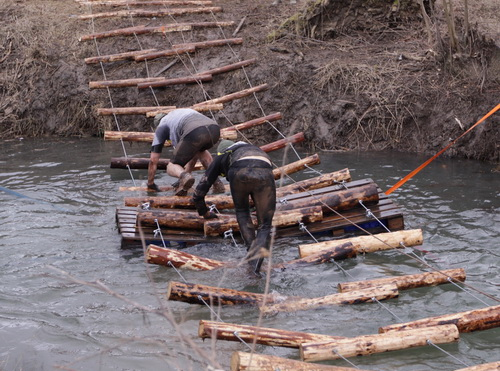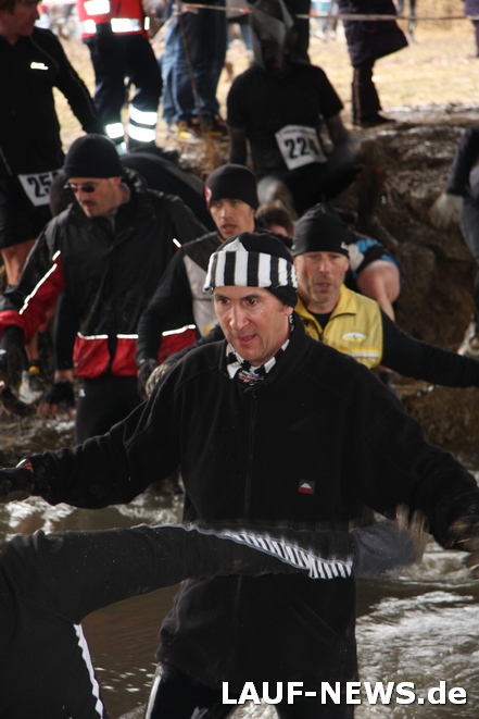 Trotz der kleinen Schar an Läufern gab es keinen Massenstart, sondern es wurde in Gruppen gestartet, um nicht den Stau am ersten Hindernis zu haben, der vom StrongManRun her berühmt und berüchtigt ist. Ich startete mit Bernie und seinen Freunden ganz hinten und hatte auch vor, bei den Vieren zu bleiben. Aber schon beim ersten Hindernis, einer Flußdurchquerung, habe ich die Jungs nicht mehr gesehen und musste mich also alleine auf die lange Strecke wagen.