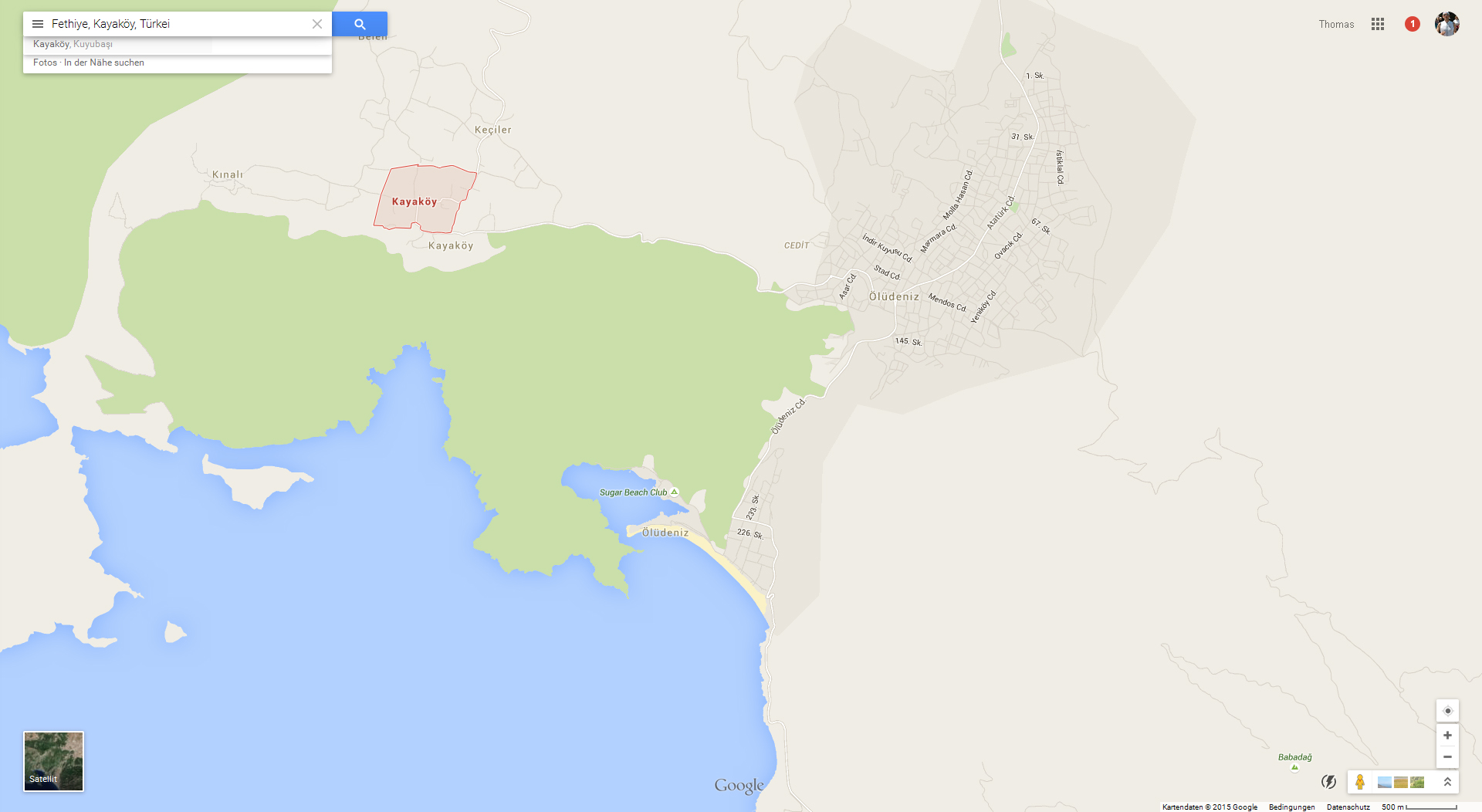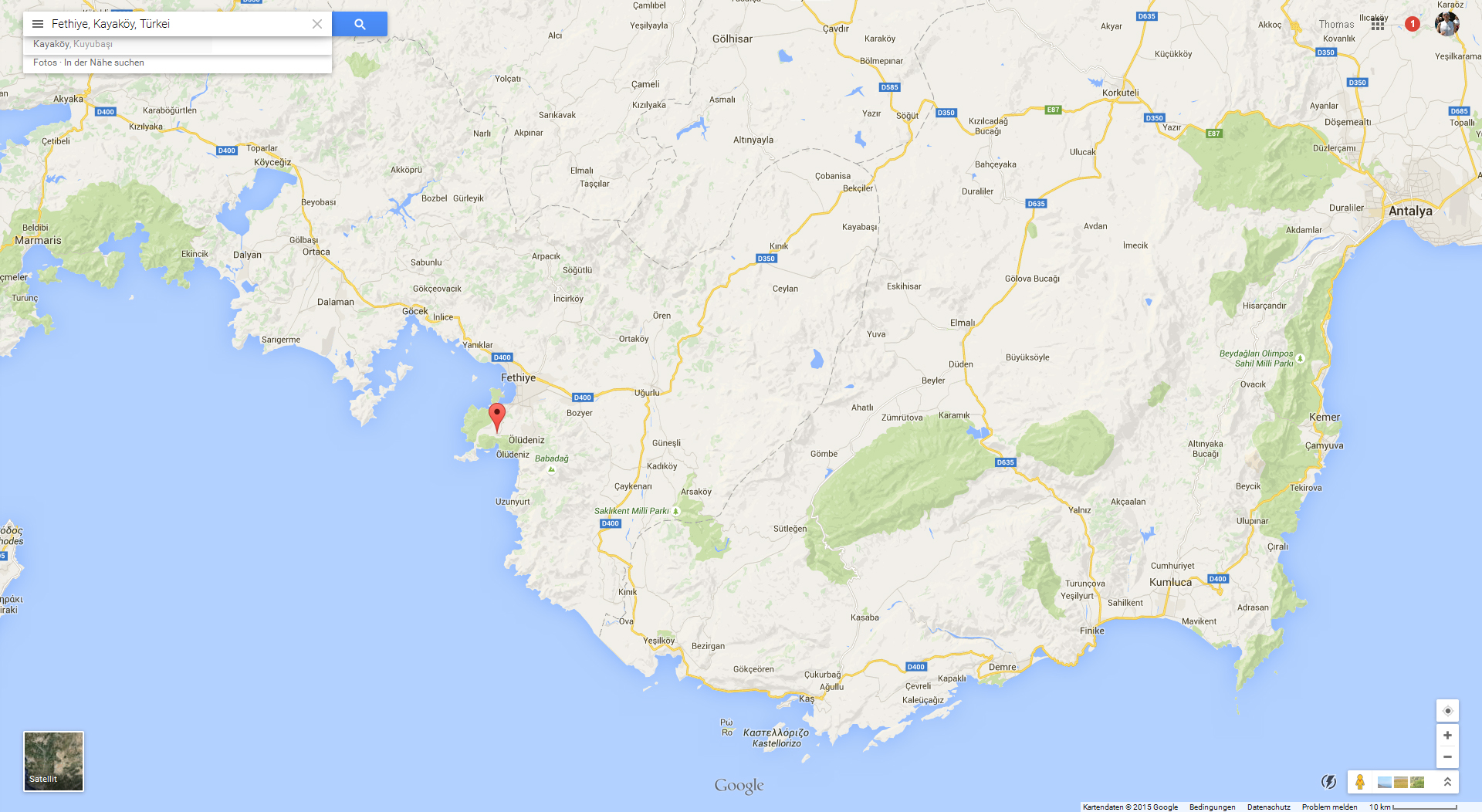 Dalaman mit dem Flughafen ganz links, der Start des Lykischen Wegs als roter Pfeil und das Ende des Trails bei Antalya ganz rechts. (Klicken zum Vergrößern!)
